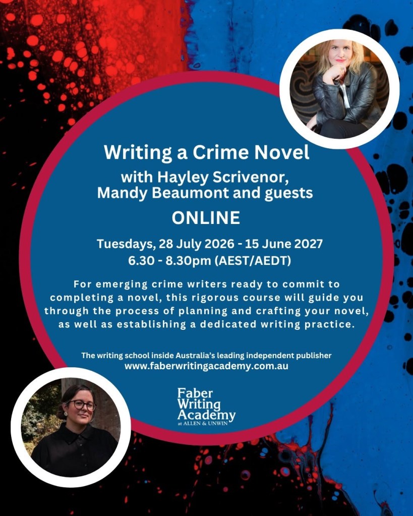 Applications are now open (including early-bird spots and partial and full scholarship places) for a brand NEW year-long course on writing a crime novel that I am presenting along with Mandy Beaumont for Allen & Unwin’s Faber Writing Academy. It will run on Tuesday nights from 6.30 to 8.30pm, and has been designed not to clash with school holidays.